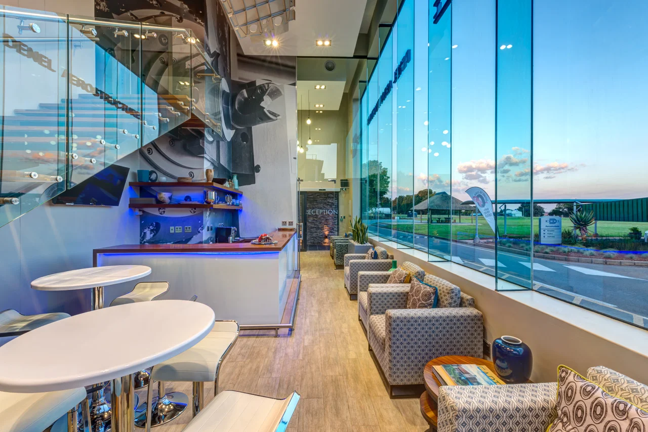 The Denel stand for 2014 was visually captivating with large high gloss black and white display towers with invigorating, backlit graphic panels. LED banner screens framed the stand, while the blue led lights, visible throughout the stand, further drew in visitors. The stand also included an informal bar area and meeting rooms with intricate fitted carpets, full size black and white graphics and beautiful 3D wall paneling. The elegant, impactful furniture further added to the high quality finish of the stand. The outdoor stand comprised of a double storey structure with a glass facade and wooden deck. Meeting rooms and an interactive bar and cocktail area were the main attractions of this outdoor stand. The outdoor area was also made up excellently to host all large vehicles and weaponry. The Denel outdoor stand was once again awarded the best outdoor stand award. Denel also had a marquee at the expo, which was elegantly made up with slatted wood panel detailing, suspended exposed globe lights and enchanting solid oak dining tables with coir rugs. The outdoor area had an exquisite deck area overlooking the runway, with white umbrellas and comfortable outdoor furniture from which one could watch the airshow.